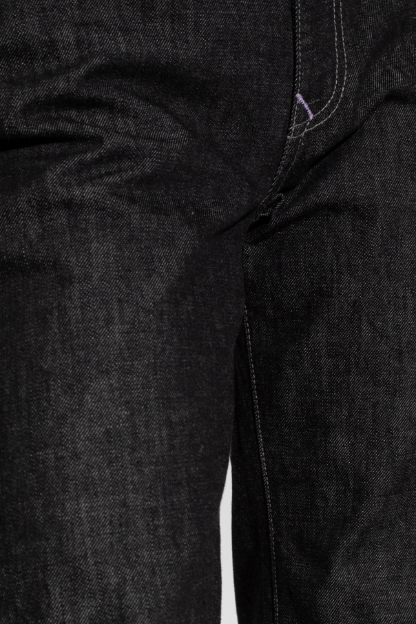 Black jeans from Vivienne Westwood. Fastened with a zip and button, this flared pair features embroidered lettering and logo in red, decorative stitching details, three front pockets and two back pockets.