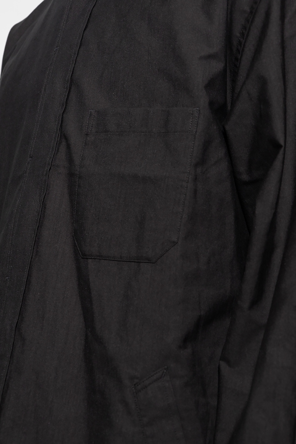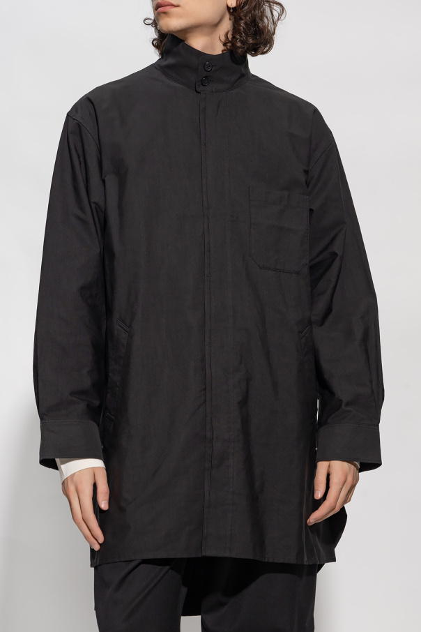 Black shirt with a standing collar from Y-3 Yohji Yamamoto. Crafted from a blend of cotton and recycled material with a long fit, this style fastens with concealed placket buttons and features an applied buttoned strap with a logo application, three slip pockets and long sleeves with button cuffs.