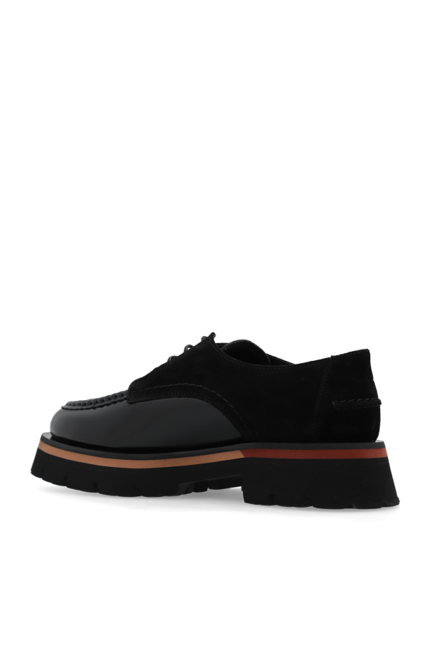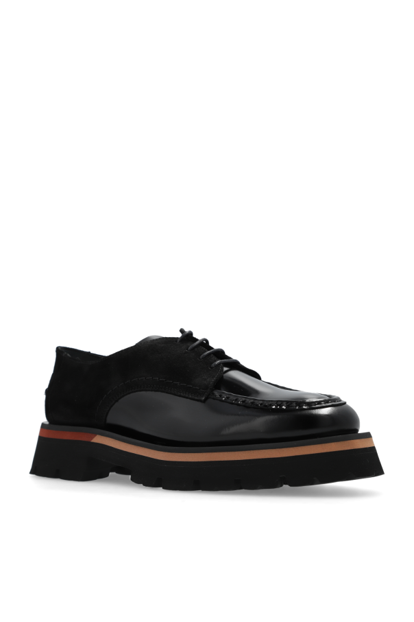 Black ‘Argon’ shoes from Paul Smith. Made of patent leather and suede, this lace-up model sits on a black, beige and brown rubber sole and showcases an embossed logo on the back.