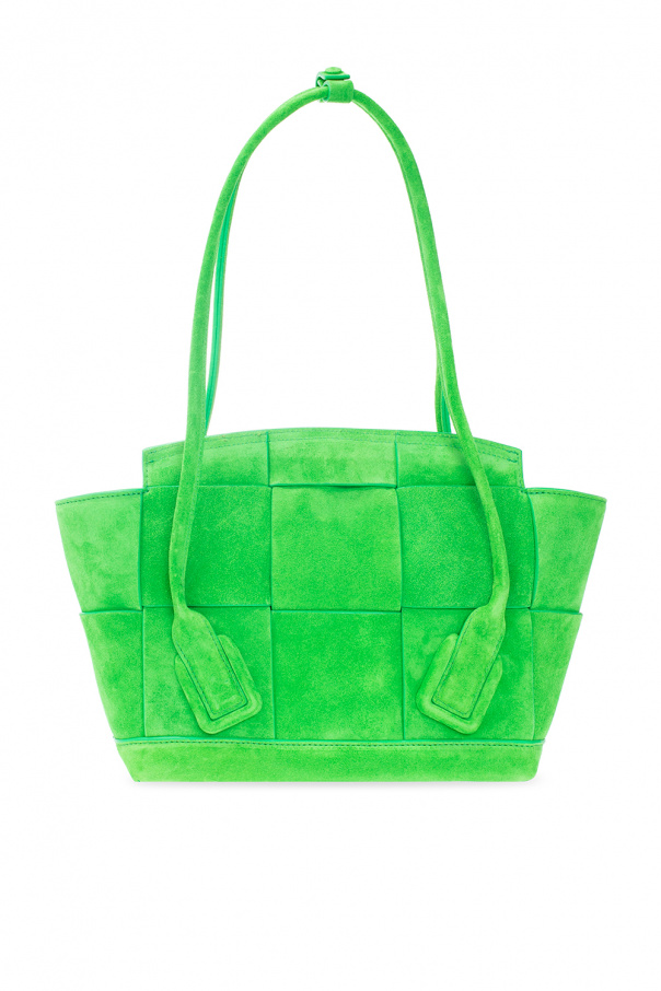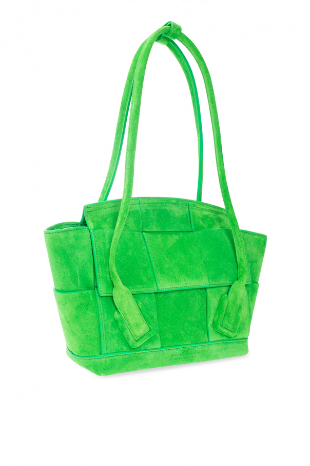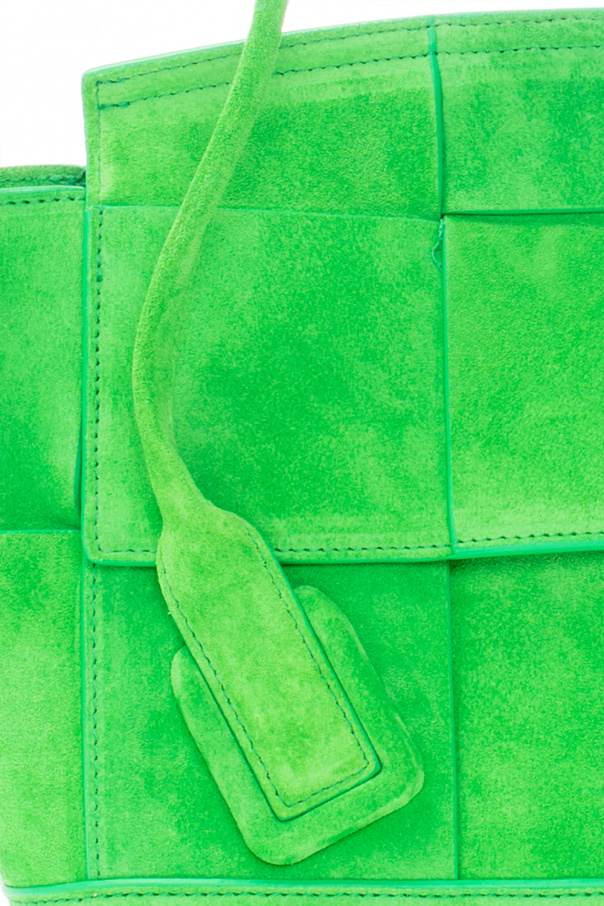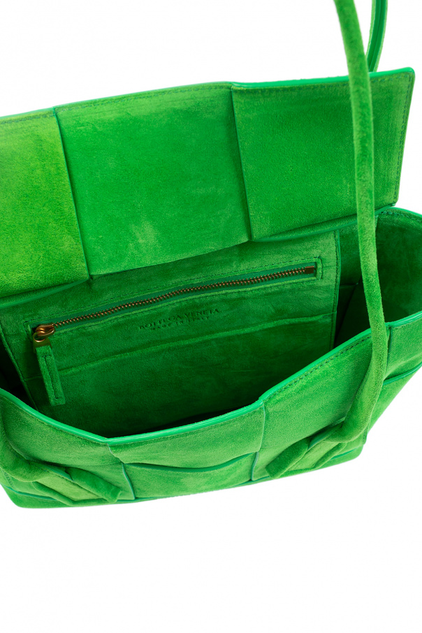 Green ‘Small Arco’ hand bag from Bottega Veneta. Crafted from suede with the iconic Intrecciato weave, this item features two half-round handles and one internal compartment with two slip pockets and one zip pocket.
