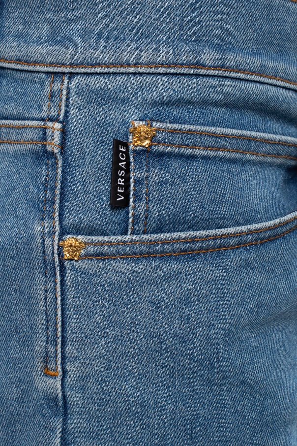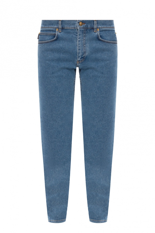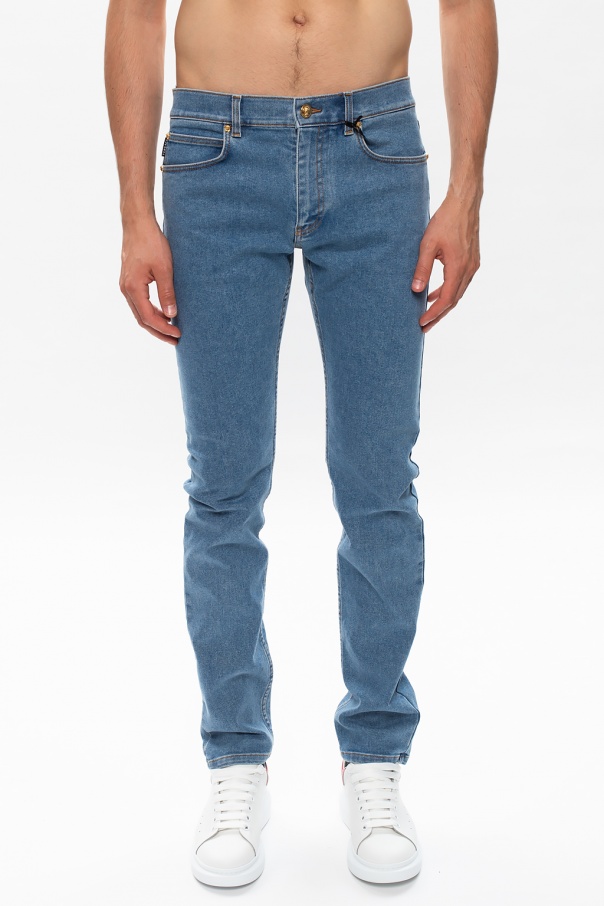 Blue jeans from Versace. Crafted from the stretch cotton, this pair features zip fly with gold-tone Medusa head button, five pockets and tapered legs.