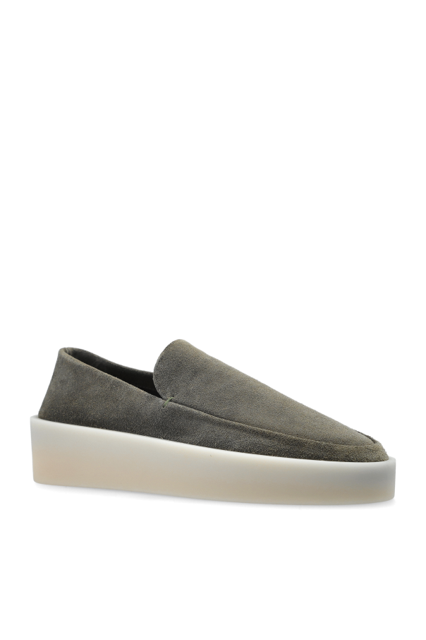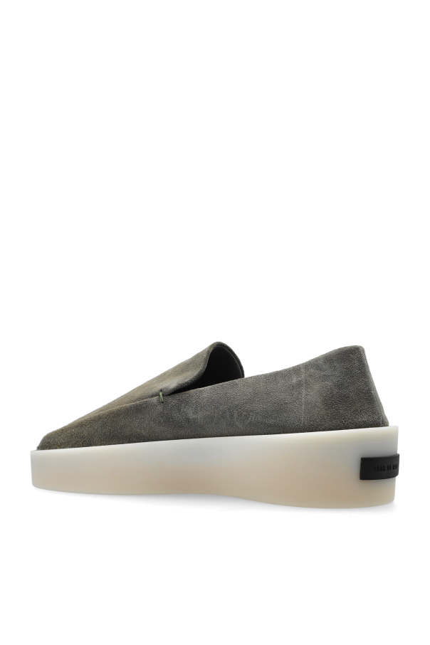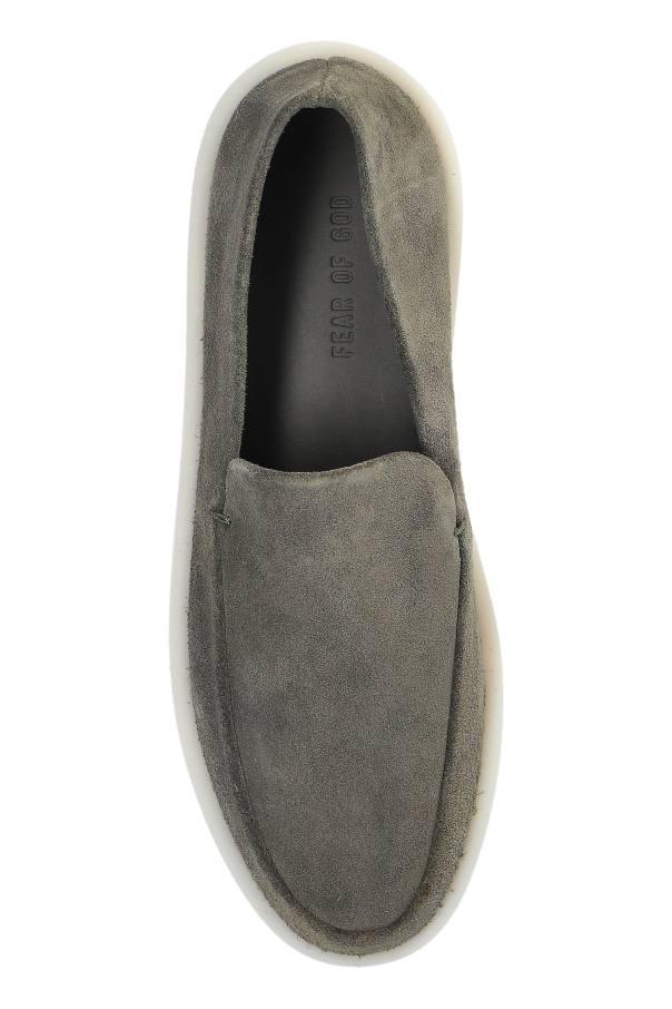 Introducing the Fear of God Loafer – a masterful blend of casual sophistication and modern elegance. Crafted from luxurious leather that mimics the sumptuous texture of suede, these loafers are a testament to refined taste. The classic design, featuring a rounded toe and low profile, ensures effortless style, while the slip-on feature adds a touch of ease to your daily ensemble. The olive green hue, a versatile shade that\'s easily paired with an array of outfits, exudes timeless allure. A contrasting white rubber sole not only enhances comfort but also injects a contemporary edge, making these loafers a standout choice for the discerning individual. Subtle yet striking, the discreet \"Fear of God\" inscription on the heel adds an element of prestige, cementing their status as a coveted piece within the realm of luxury streetwear. Why Choose This Product? Exquisite leather construction for a luxurious appearance Universal olive green color for versatile styling Modern design with a contrasting white sole for added flair Comfortable slip-on style for everyday elegance Prestigious brand association with Fear of God