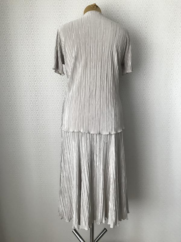 Нарядный / повседневный костюм приятного жемчужного цвета - такого светло серо-бежевого. Ткань гофре - мягкая, приятная к телу. Состоит из блузы обманки (выглядит как кардиган, наброшенный на топ) и юбки. Отложной воротничок блузы декорирован бисером. Юбка на подкладке практически по всей длине.