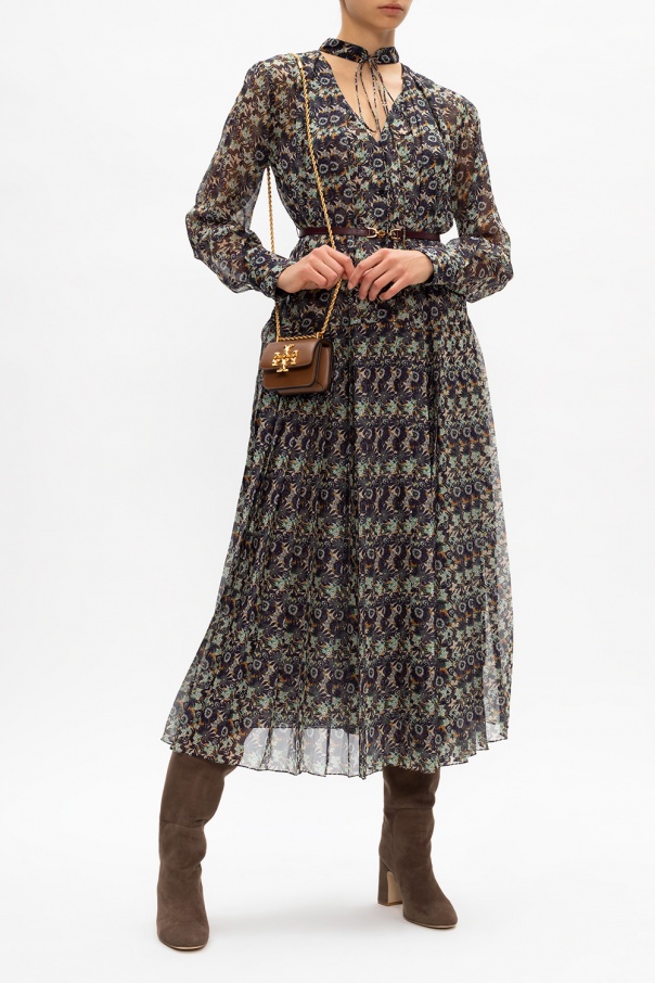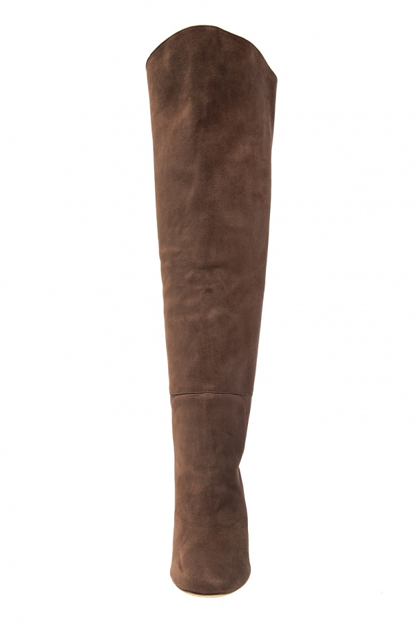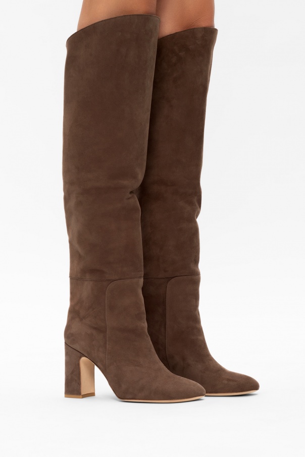 Light brown ‘Lucinda’ heeled boots from Stuart Weitzman. Crafted from suede, this slip-on design is enriched with stitching details and rests on a cream leather sole.