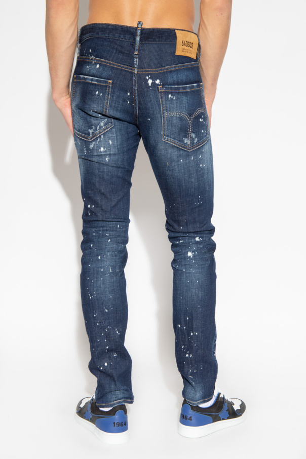 Navy blue ‘Cool Guy’ jeans from Dsquared2. Crafted from cotton with a vintage effect, this pair falls with tapered legs and features button fastenings, classic five pockets, paint splatters and decorative appliqués.