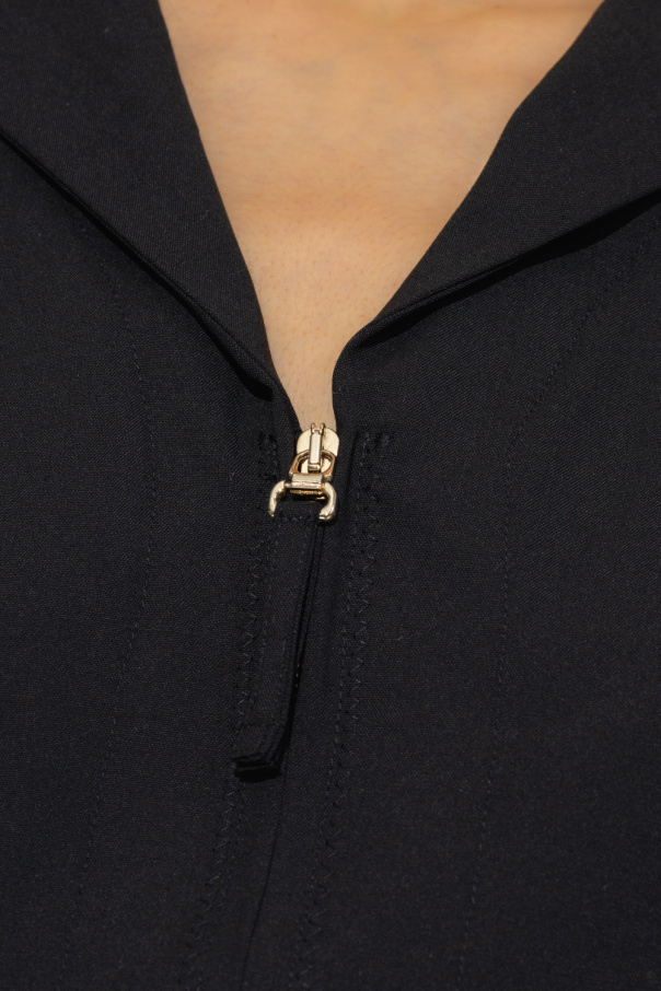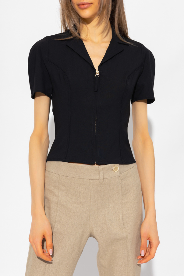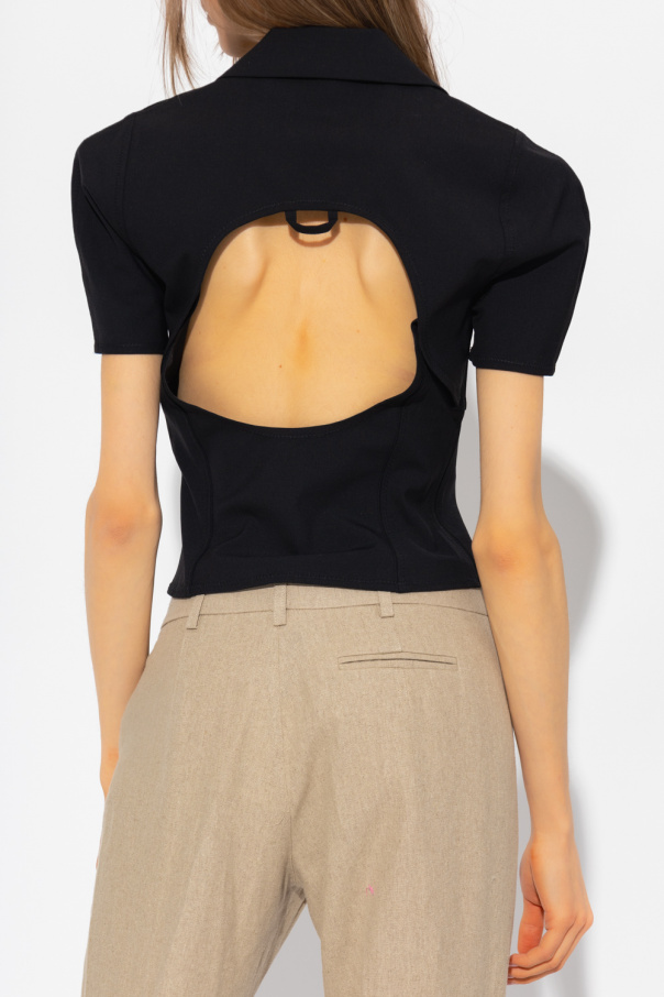 Black top with a collar from Jacquemus. Crafted from a stretch wool blend, this style features a slim-fitting silhouette, a front zip fastening, decorative seams, short sleeves and a cut-out back.