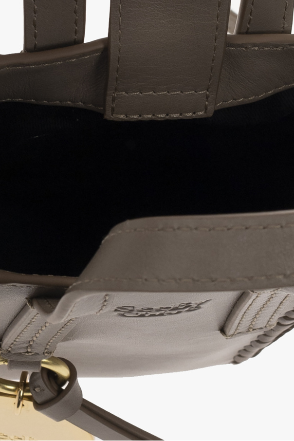 Grey ‘Tilda Mini’ shopper bag from See By Chloé. Crafted from smooth leather and suede, this design secures with a magnetic snap and features an embossed logo on the front, decorative stitching details, detachable keyring with fringes and round logo charm, two half-round handles, long strap, gold-tone metal hardware and one internal compartment.