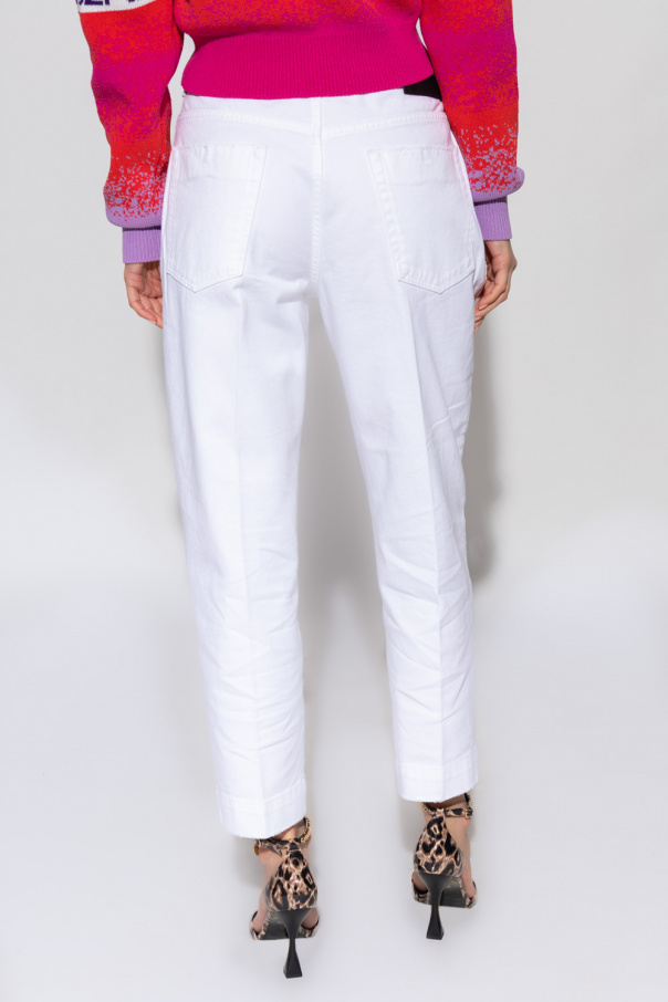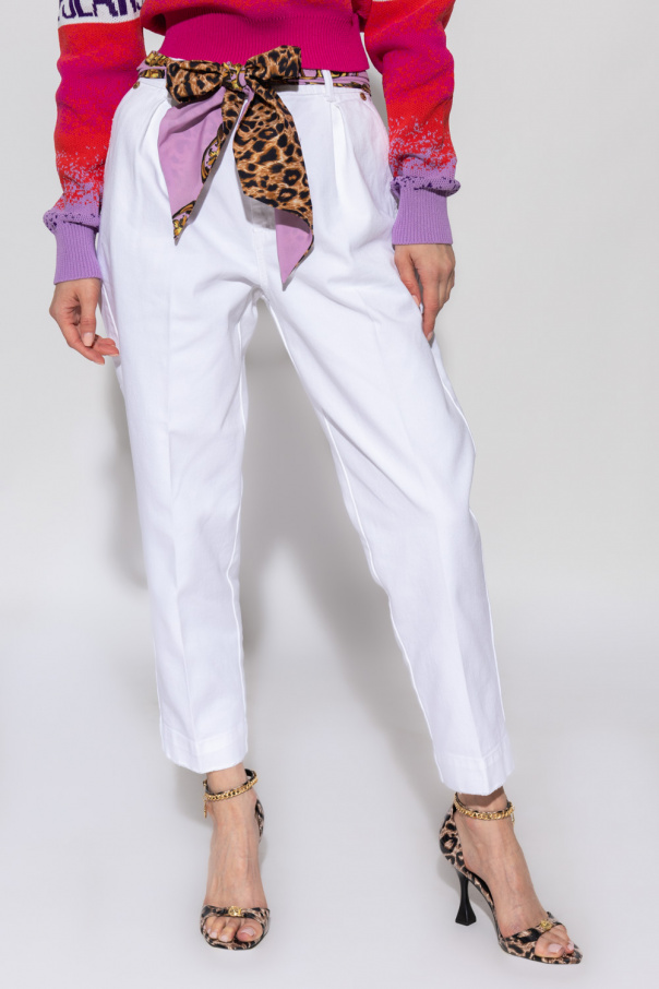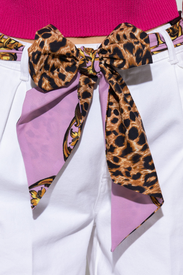 White loose-fitting distressed jeans from Versace Jeans Couture. This high-waisted design features a zip and button closure, purple, brown and black scarf belt with an animal motif and the iconic ‘Regalia Baroque’ print, decorative pleats, two front pockets, two back pockets and slightly tapered legs.
