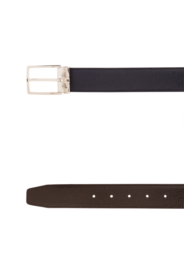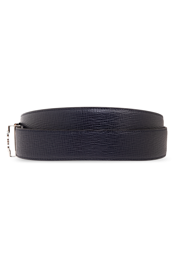 Reversible belt in dark brown and navy blue from FERRAGAMO. Made of textured leather, this item features a silver-tone logo buckle.