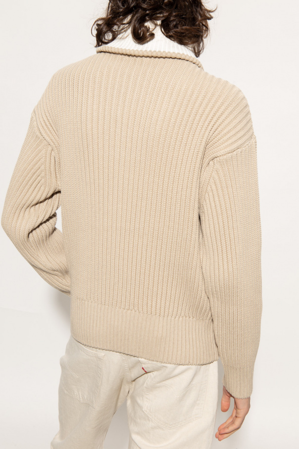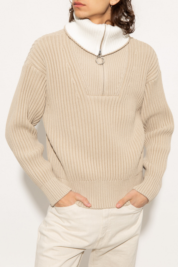 Beige turtleneck sweater from Ami Alexandre Mattiussi. Crafted from a wool and organic cotton blend with a distinctive knit, this style features a white trim with a quarter-zip closure at the collar and elasticized trims on the bottom hem and cuffs.