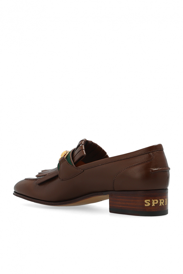 Brown loafers from Gucci. Made of leather, this pair features tassels, appliqués with a green and red Web stripe, the brand’ signature gold-tone horsebit detail, ‘Palm Springs’ lettering and beige leather sole.