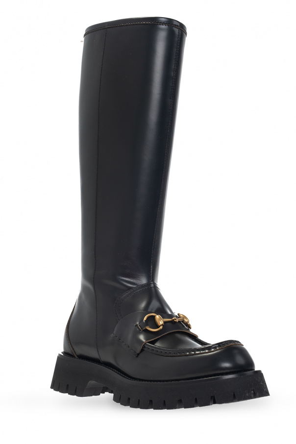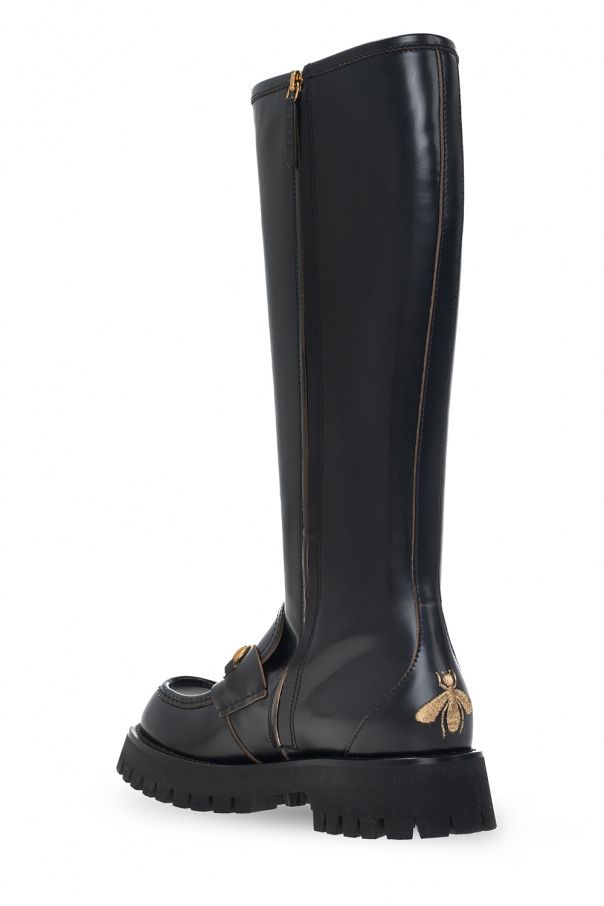 Black knee-high boots from Gucci. Made of leather, this pair features a side zip, the iconic horsebit, embroidered bee motif in gold-tone and a black rubber sole.