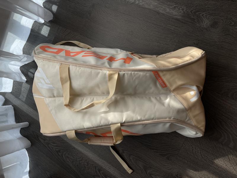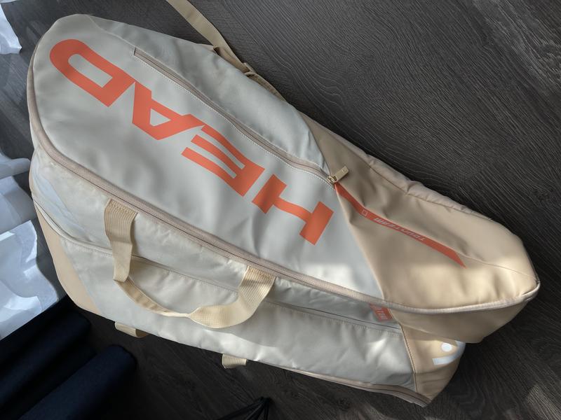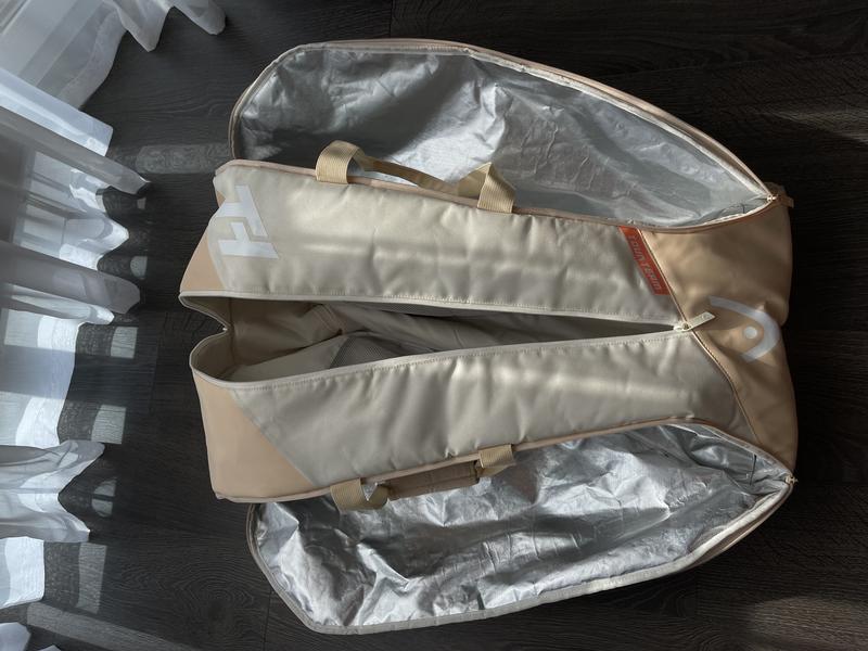 Сумка для большого тенниса. Три отделения, 2 из которых для ракеток с функцией хранения температуры. В данной модели камера выстлана специальным алюминиевым термоматериалом. Внешний карман для аксессуаров. Можно надеть как рюкзак или нести горизонтально или вертикально. Имеет незначительные загрязнения. Все застежки рабочие. Повреждениях никаких нет.