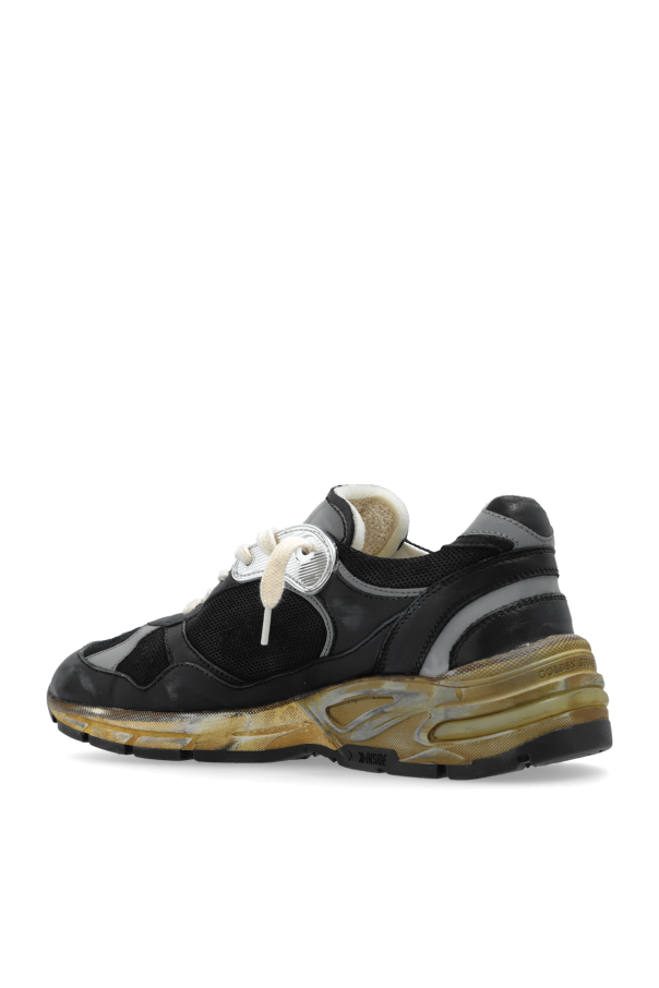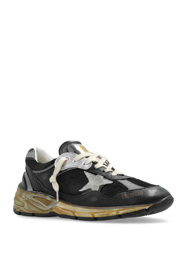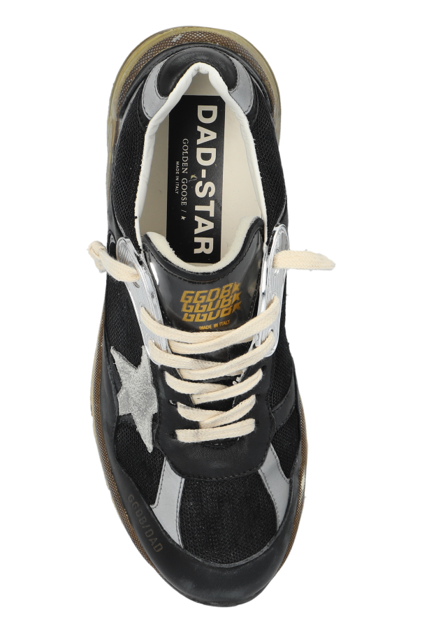 Introducing the Running Dad sports shoes by Golden Goose, a luxurious embodiment of style and comfort. These exclusive low-top sneakers feature a classic silhouette and a distinctive design, blending various materials and textures for a unique, fashionable appearance. The upper is crafted from a sophisticated mix of black leather and fabric, adorned with a prominent gray star on the side panels, a signature element of Golden Goose. A multi-layered yellow sole with transparent accents adds a dynamic touch, while the irregular tread pattern ensures excellent grip and traction. Emphasizing the brand\'s identity, the side of the shoe near the front is emblazoned with the \"GOLDEN GOOSE\" logo, also appearing on the tongue in striking yellow. The insole features the inscriptions \"DAD-STAR\" and \"GOLDEN GOOSE,\" highlighting the exclusive nature of these sneakers. Designed with functionality and style in mind, these lace-up shoes come with white laces and a vintage effect, complete with reflective details that enhance their visual appeal. The dominant black color is complemented by gray, white, and yellow accents, making them perfect for those who appreciate both fashion and comfort. Why Choose This Product? Exclusive Design: Unique blend of materials and textures. Brand Signature: Iconic Golden Goose star and logo details. Dynamic Look: Multi-layered yellow sole with transparent elements. High-quality Materials: Leather and fabric for durability and comfort. Functional Features: Irregular tread pattern for excellent grip. Reflective Details: Enhances visibility and style.