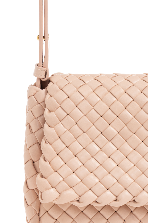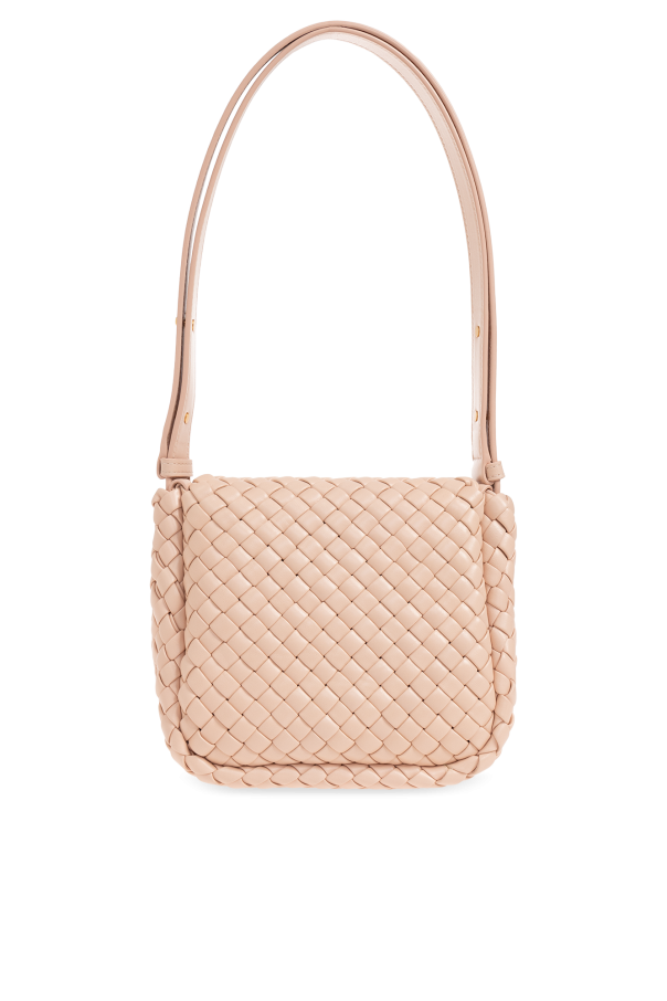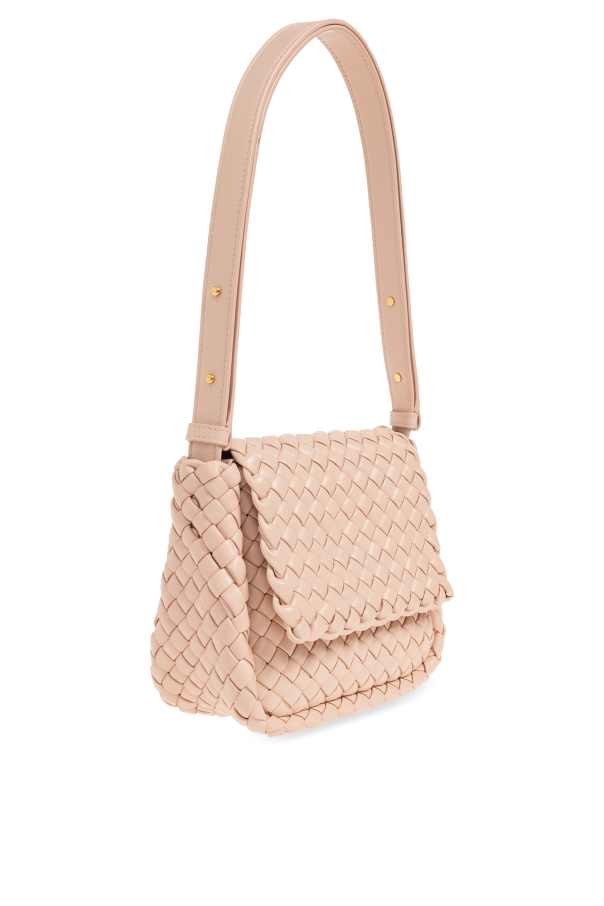 Blush pink ‘Cobble Mini’ shoulder bag from Bottega Veneta. Made of the brand’s signature Intrecciato lamb leather, this model features a hook fastening, adjustable strap, one internal compartment and gold-tone metal hardware.
