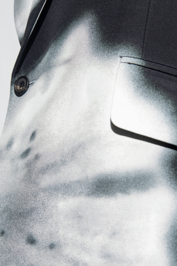 White and black blazer from Alexander McQueen. Crafted from wool, this design features buttons, a decorative pattern, peak lapels, three pockets and single rear vent.