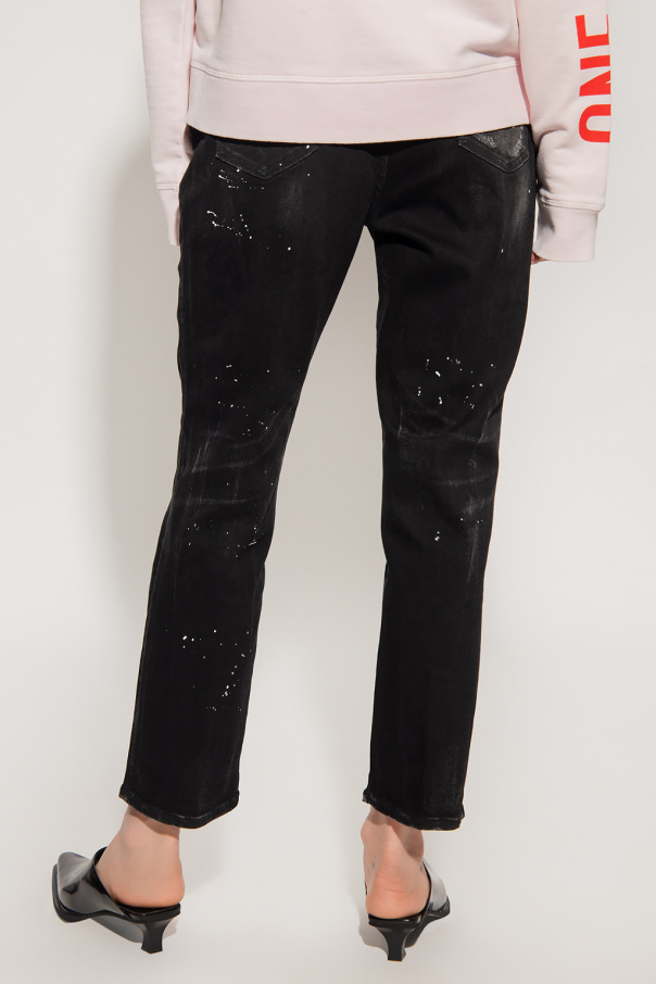 Black ‘Curvy Baggy’ distressed jeans from Dsquared2. Fastened with a zip and button, this pair features a logo patch, red and black Honey tag at the back, a paint splatter effect, three front pockets, two back pockets and loose-fitting tapered legs.