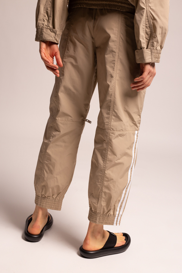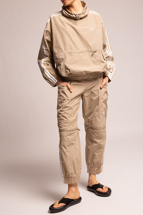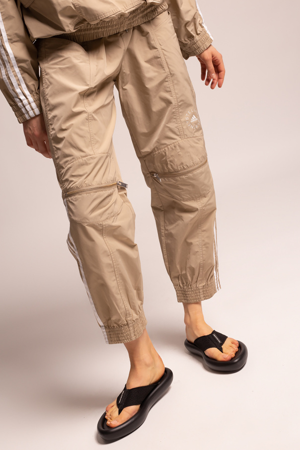 Beige and white trousers from Adidas By Stella McCartney fastened with drawstrings, this pair features a white logo print and multiple pockets.