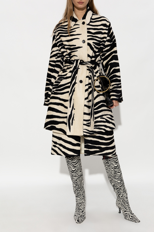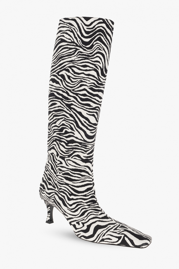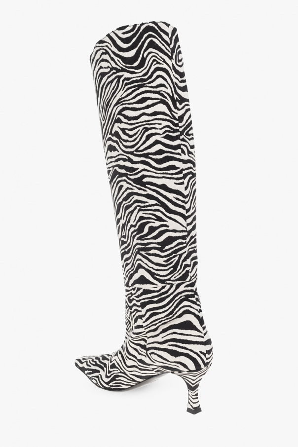 Black and white heeled boots from Proenza Schouler. Made of fabric with an animal pattern, this pair features a square toe and black leather sole.