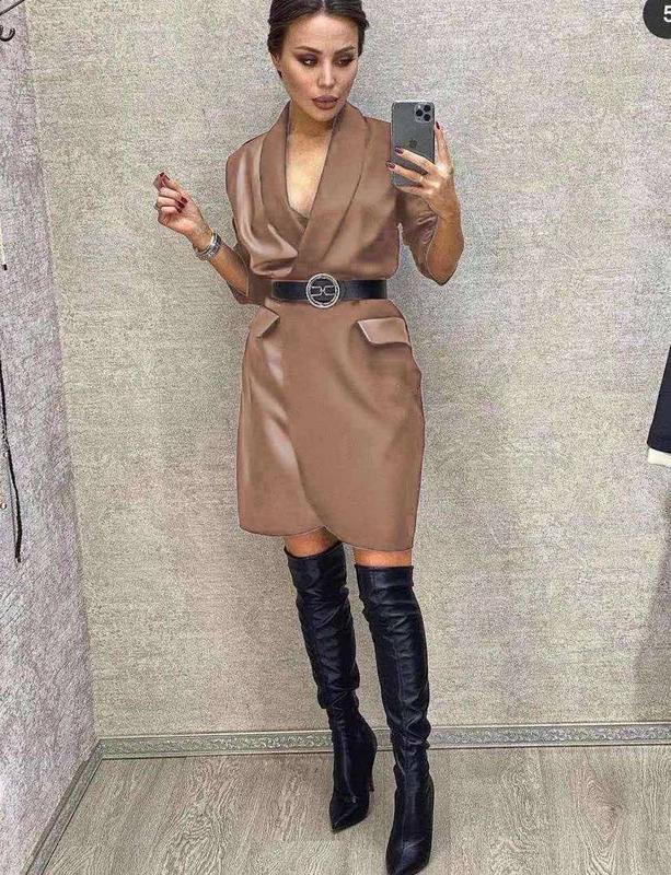 Фабрична якість, повністю закриті передні полички сукні (внутрішня частина виконана з костюма, тобто як підклад у піджака). Всередині сукня на зав'язці, що дасть вам впевненість у носінні. Декоративні клапани виконані з екошкіри, кишені немає. Спинка виконана з костюмки. У комплекті йде шкіряний пояс (виконаний з екошкіри без пряжки)---------------------