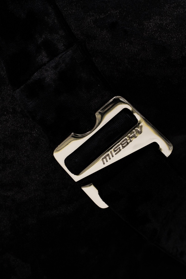 Black ‘Hooked’ crewneck bodysuit from MISBHV. Crafted from soft, velvet-like velour, this long-sleeved garment fastens via press-studs at the crotch and showcases silver-tone buckle strap with embossed logo.