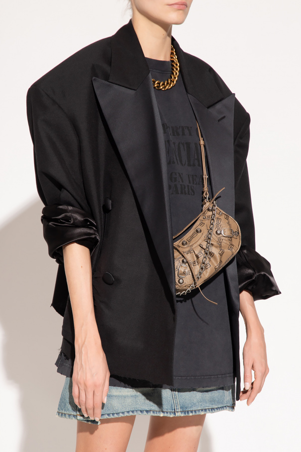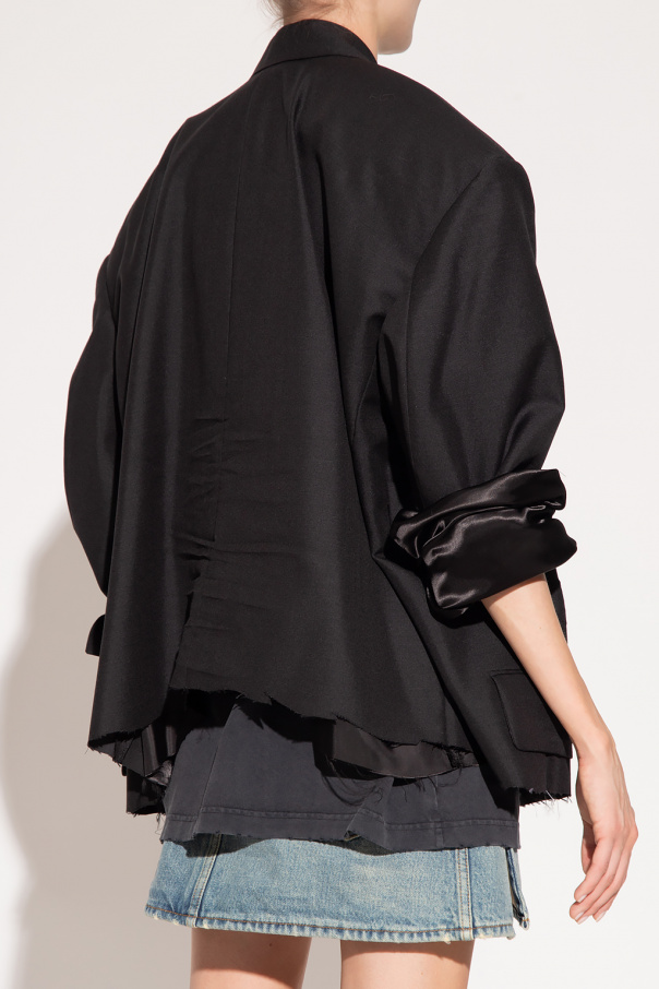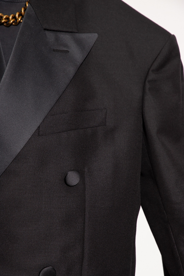 Black double-breasted tuxedo blazer from Balenciaga. Crafted from a wool and mohair blend, this boxy garment features peak lapels with a satin finish, padded shoulders, wide sleeves and asymmetric, raw-trimmed hem.