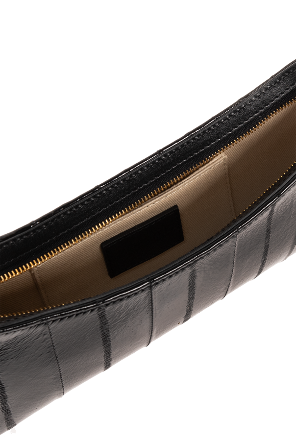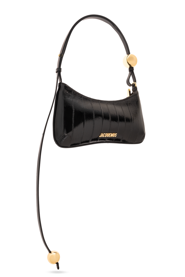 Black ‘Le Bisou Perle’ shoulder bag from Jacquemus. Made from glossy leather, this design fastens via a zip and showcases a metal logo plaque, gold-tone metal elements as well as an adjustable shoulder strap with decorative beads and one internal compartment with a card slot.