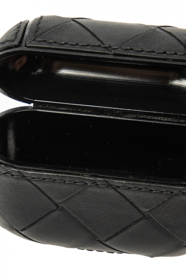 Black AirPods case from Bottega Veneta. Crafted from leather, this accessory features the label’s signature ‘Intrecciato’ weave and a neck strap.