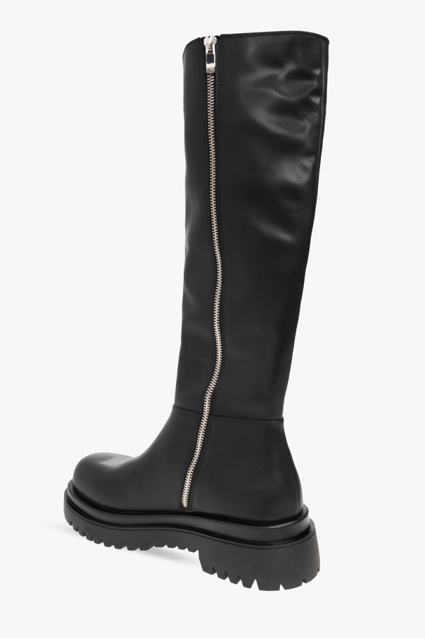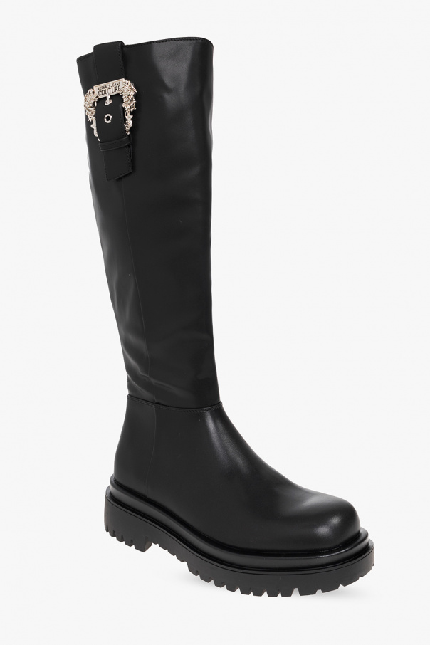 Black boots from Versace Jeans Couture. Fastened with a zip, this pair features a silver-tone logo appliqué, almond toe and black rubber sole.