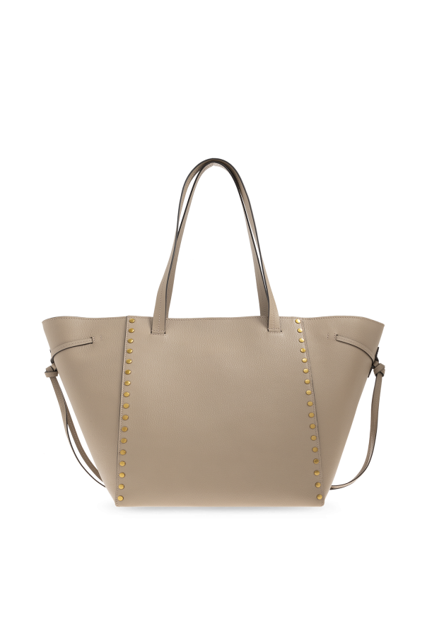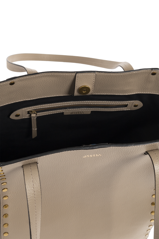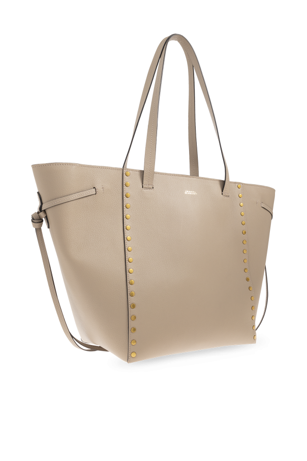 Greyish-beige ‘Oskan’ shopper bag from Isabel Marant. Made of bovine leather, this design is embellished with the brand\'s logo on the front and gold-tone studs and features a magnetic fastener, distinctive knots on the sides, two half-round handles and one internal compartment with a zip pocket.