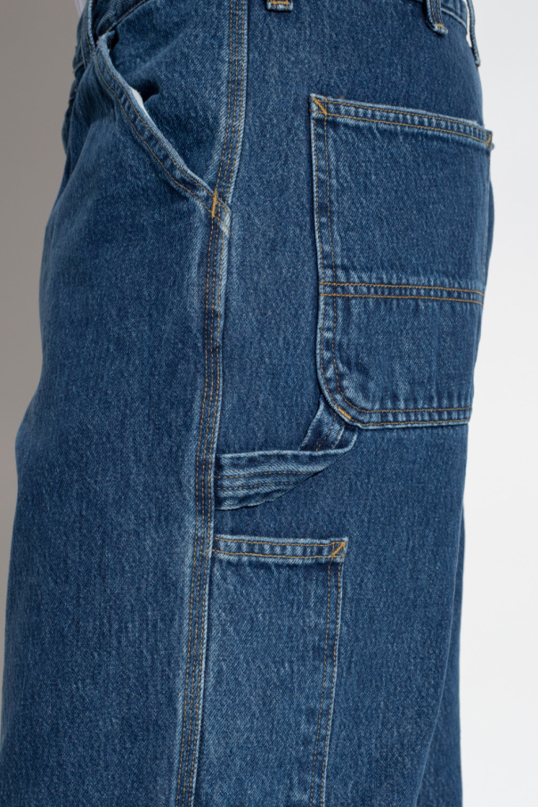 Dark blue ‘Single Knee’ jeans from Carhartt WIP. Falling with straight legs, this pair features a zip fly with a button, seven slip pockets and a logo patch at the back.