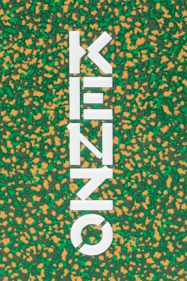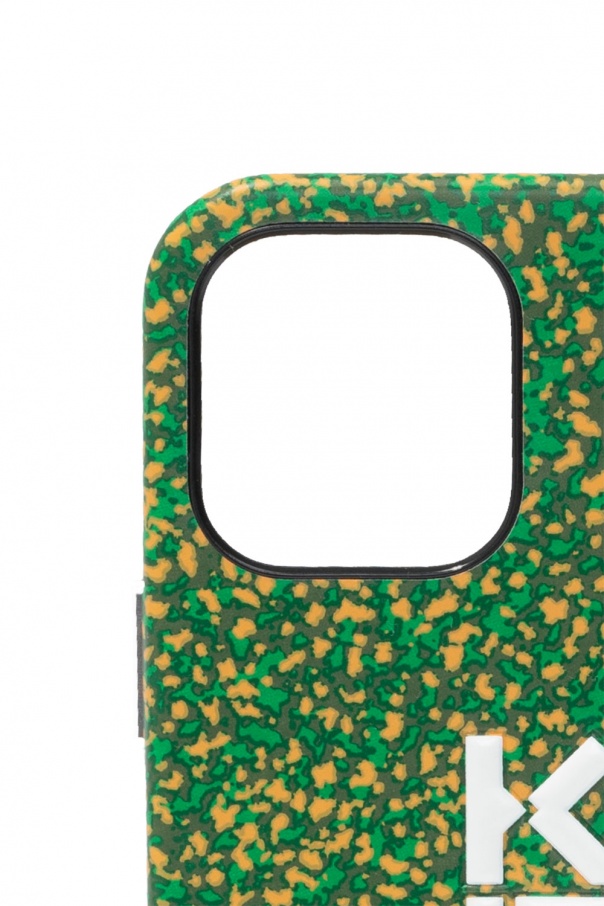 Green, yellow and brown iPhone 12 case from Kenzo. This item is decorated with a printed pattern and logo in white.