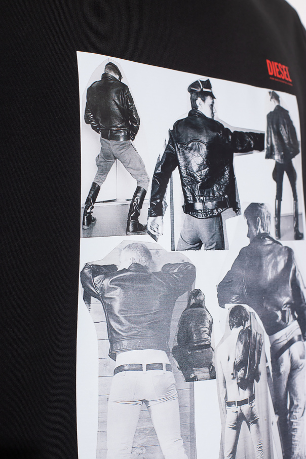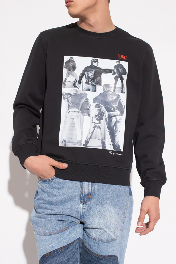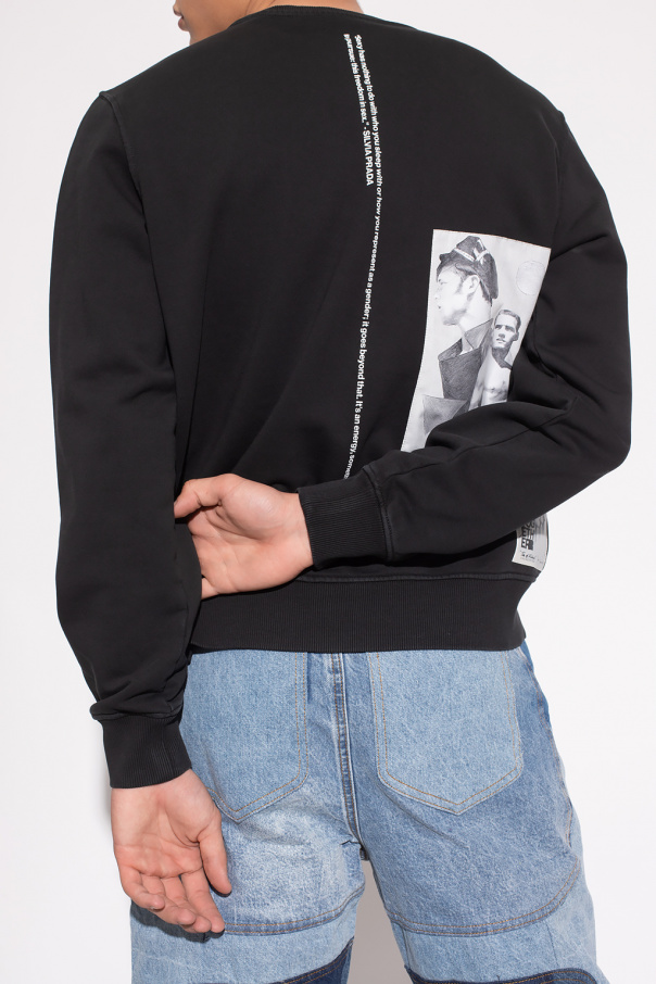 Black ‘PR-S-GINN’ sweatshirt from Diesel, the ‘ToFF’ capsule collection. Crafted from cotton, this garment features grey, white and black patches with a graphic from the catalogue of the Tom of Finland Foundation, red logo, Silvia Prada’s quote and ribbed trims at the crew neck, hem and cuffs.