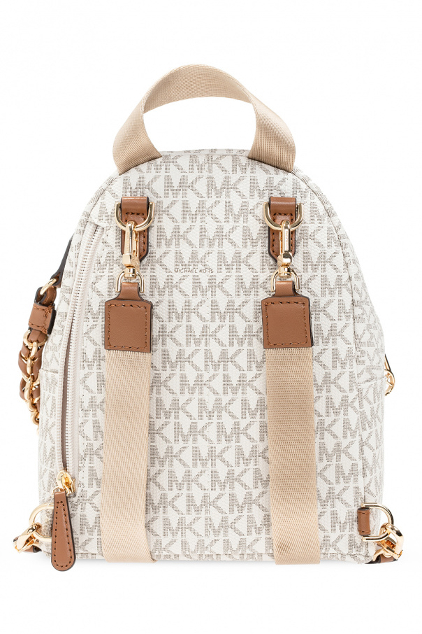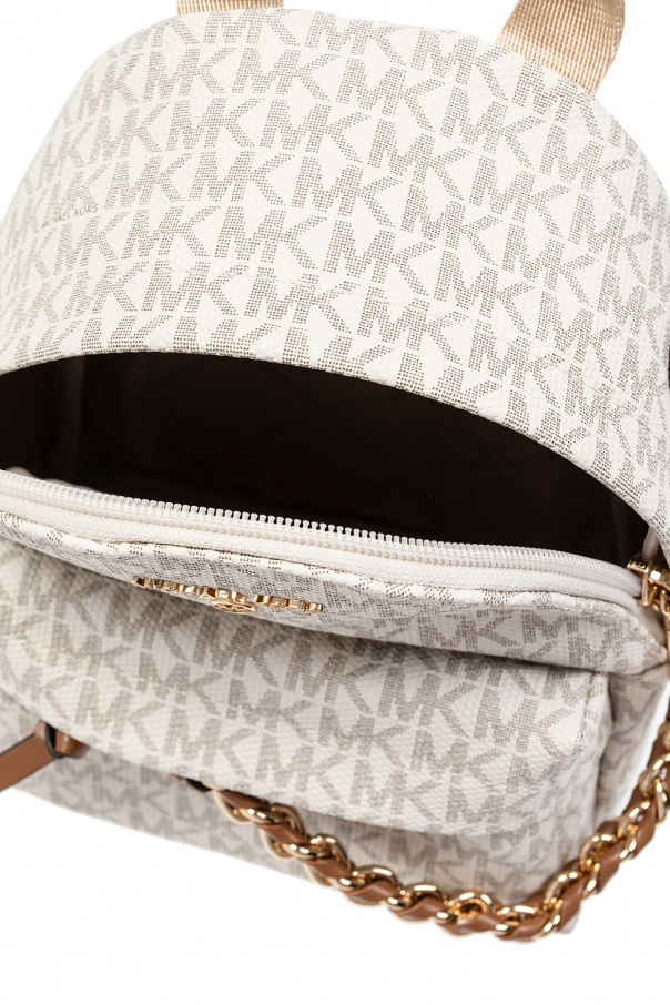 Cream ‘Slater’ backpack from Michael Michael Kors. Fastened with a zip, this design is decorated with a logo print and metal logo detail. It is complete with a decorative strap with a chain, front and back zip pocket, half-round handle, gold-tone metal hardware and one internal compartment with one slip pocket.