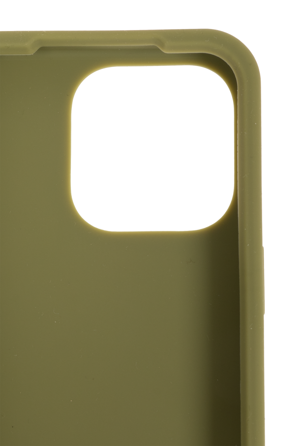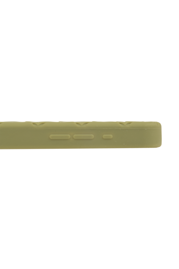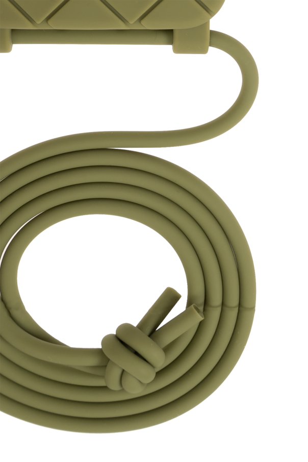 Khaki iPhone 15 Pro case from Bottega Veneta. Made of silicon decorated with the brand’s signature Intreccio pattern.