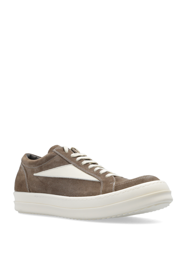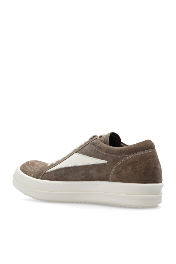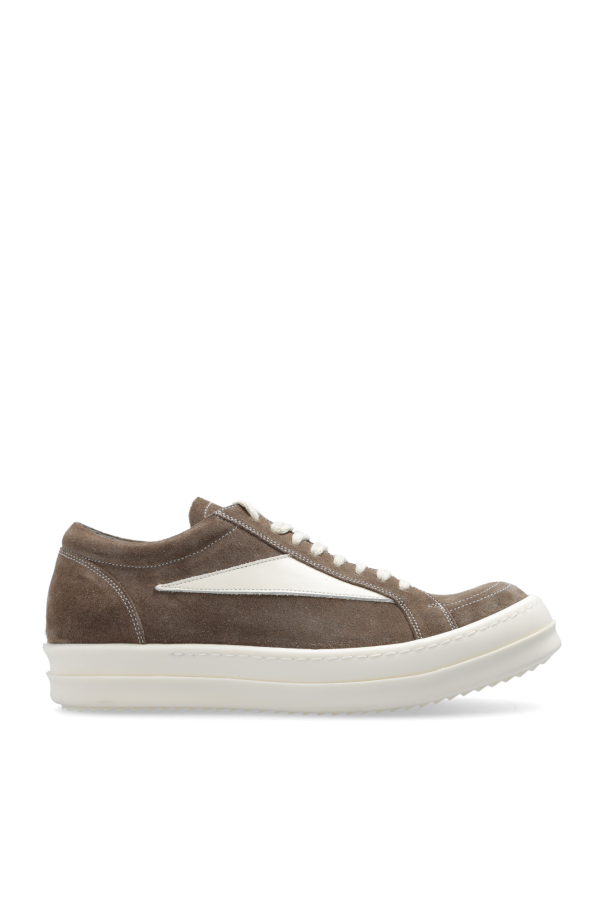 Brown and grey lace-up sneakers from Rick Owens. Made of calf suede trimmed with white leather, this pair rests on a cream rubber sole.