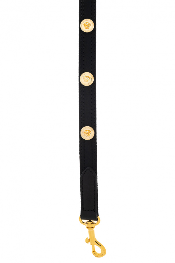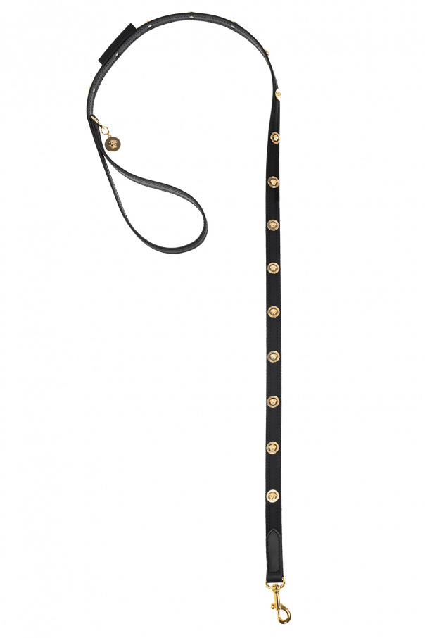 Black dog collar and leash set from Versace Home. This set is decorated with metal gold-tone appliqués with the label’s signature gold-tone Medusa head and a logo charm. The collar is adjustable and fastens with a metal buckle. The leash has a metal clip.