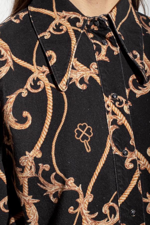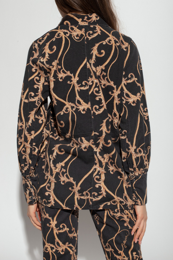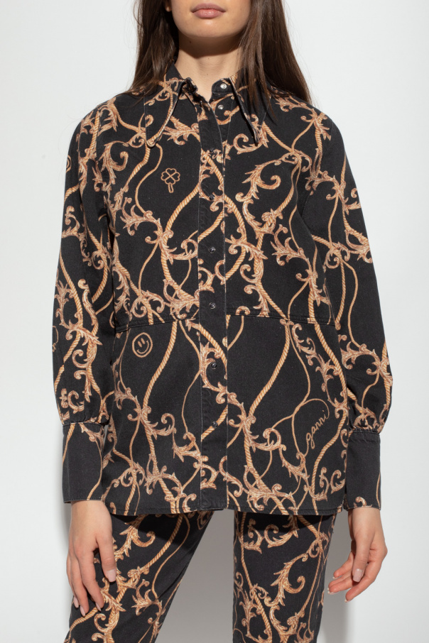 Dark grey shirt from Ganni. Made of organic cotton and TENCEL® lyocell, this garment is complete with decorative snap-fastenings, yellow and cream logo pattern and long sleeves with banded cuffs.