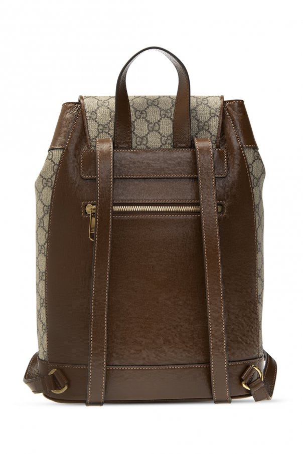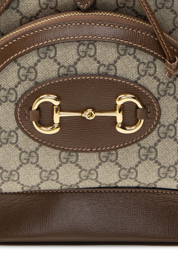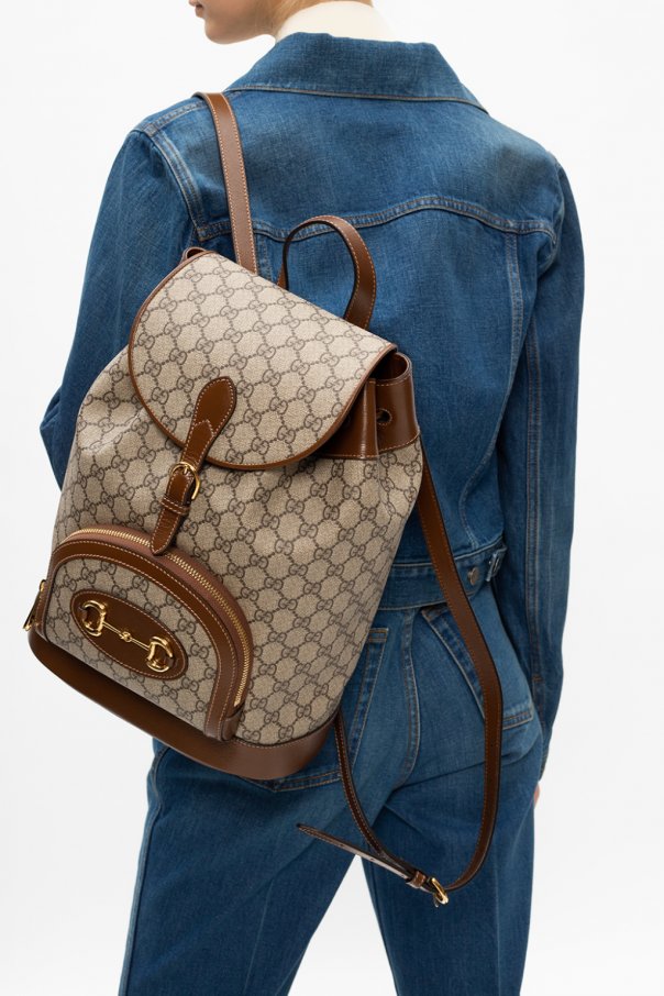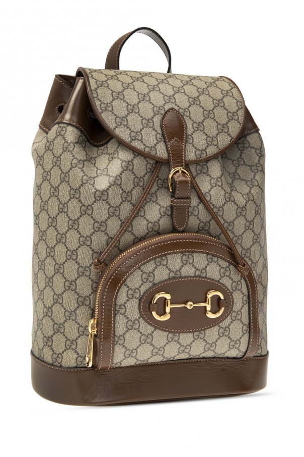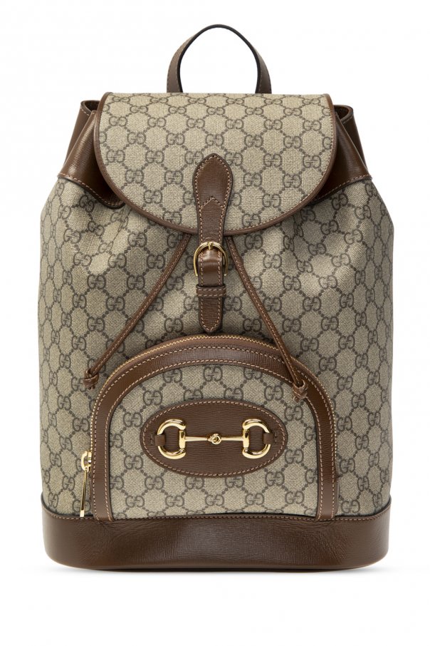 Beige backpack from Gucci, the ‘1955 Horsebit’ collection. Crafted from ‘GG Supreme’ canvas, this design is distinguished by the brand's hallmark horsebit hardware and brown leather trims and detailed with buckle strap accompanied by a drawstring closure as well as zip pocket on the front, adjustable shoulder straps and interior with one compartment, two slip pockets and one zip pocket.