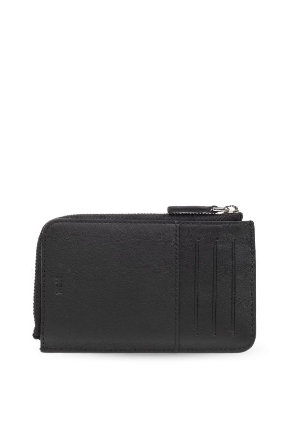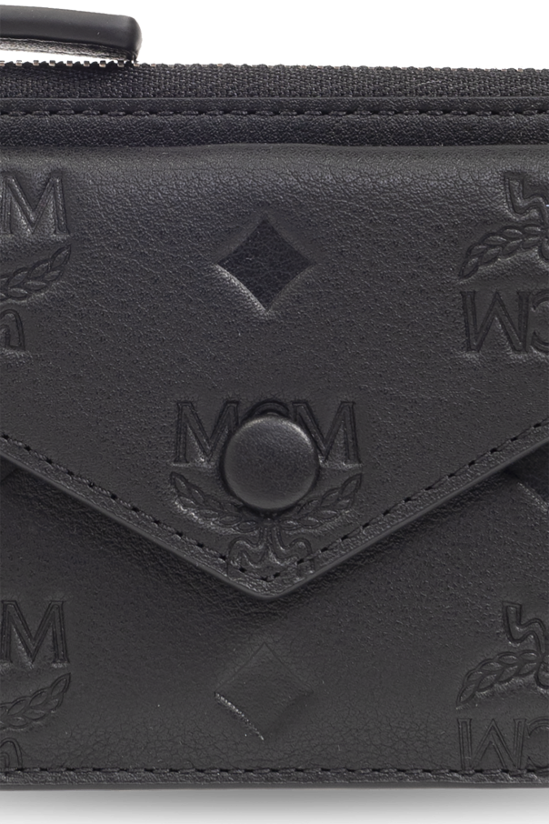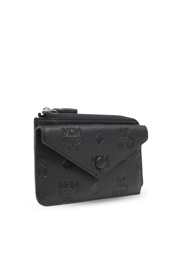 Black card holder from MCM. Made of cow leather, this item features a grey logo pattern, four card slots, one snap-fastened pocket, silver-tone metal hardware and one internal compartment with one zip pocket.