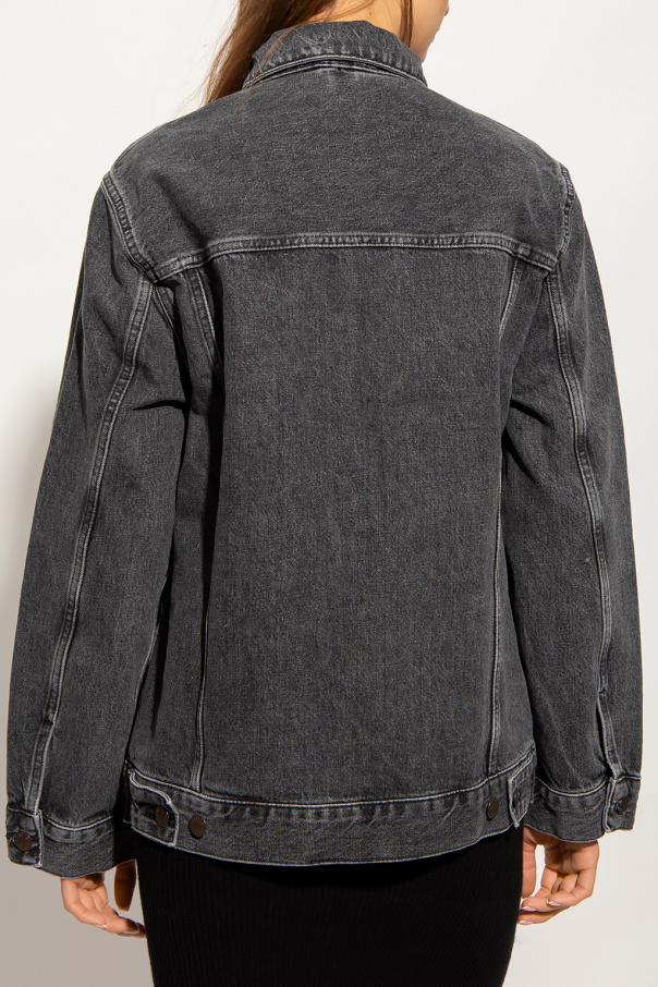 Dark grey ‘Nicole’ denim jacket from Samsoe Samsoe. Crafted from organic cotton, this style features button fastenings, long sleeves, two welt pockets and two flapped button pockets on the front.
