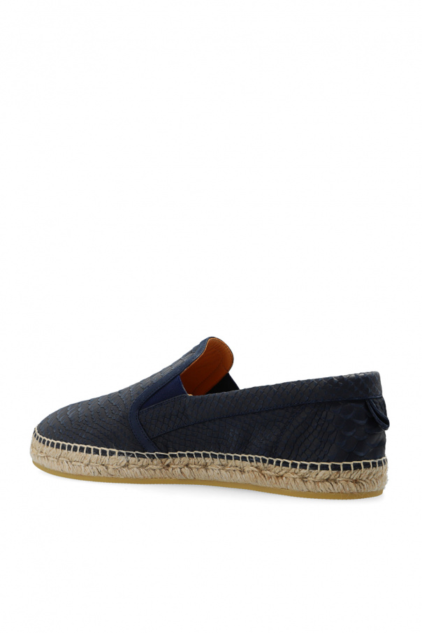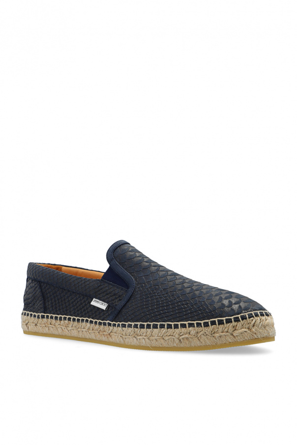 Navy ‘Vlad’ espadrilles from Jimmy Choo. Made of leather with a snakeskin effect, this pair features elastic side panels, logo patch and decorative sole with woven jute in beige and rubber trims.