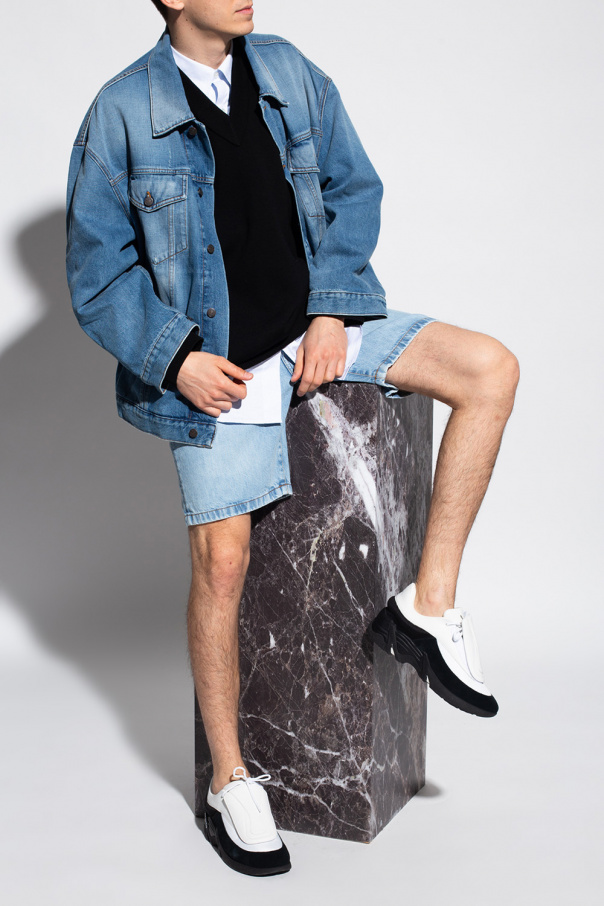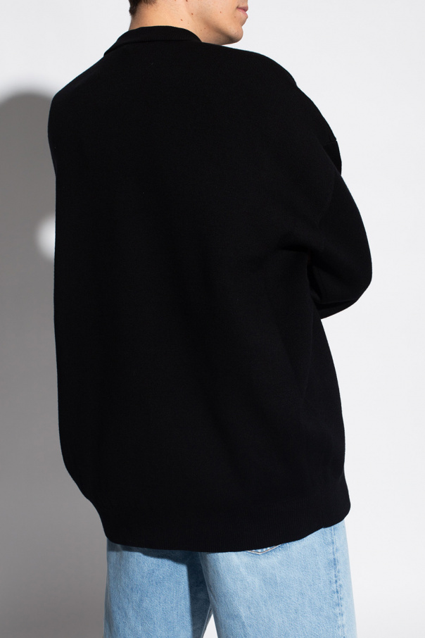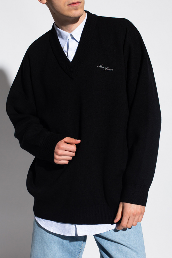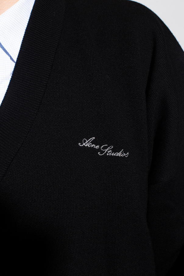 Black V-neck sweater from Acne Studios. Crafted from a wool and cotton blend, this design features an embroidered logo pattern in silver-tone and ribbed trims at the neck, hem and cuffs.