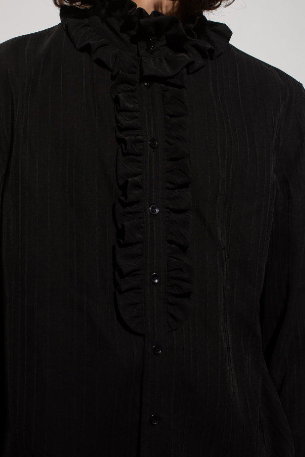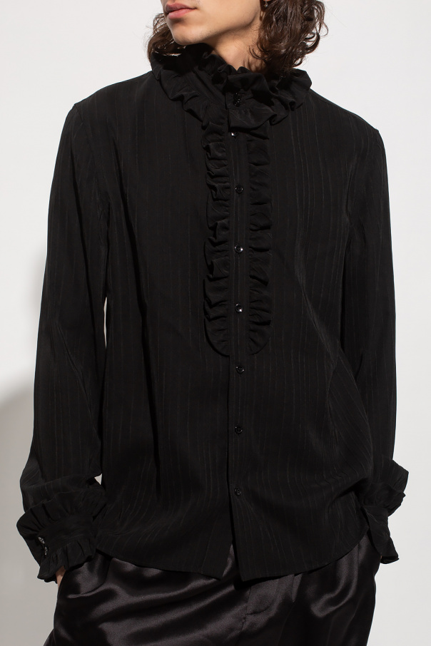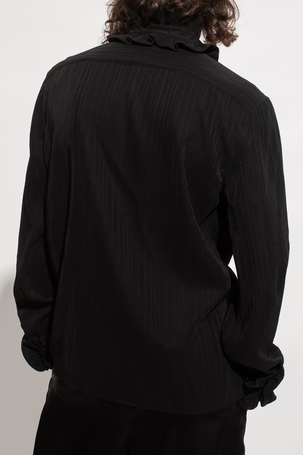 Black shirt with a band collar from Saint Laurent. Made of textured silk, this garment features button fastenings, long sleeves and Victorian-inspired ruffles at the collar and button cuffs.