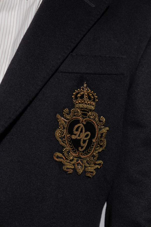 Black blazer with notch lapels from Dolce & Gabbana. Crafted from a wool and cashmere blend, this design features button fastenings, a decorative detail in antique gold-tone, two flap pockets, one slip pocket, long sleeves and a single rear vent.