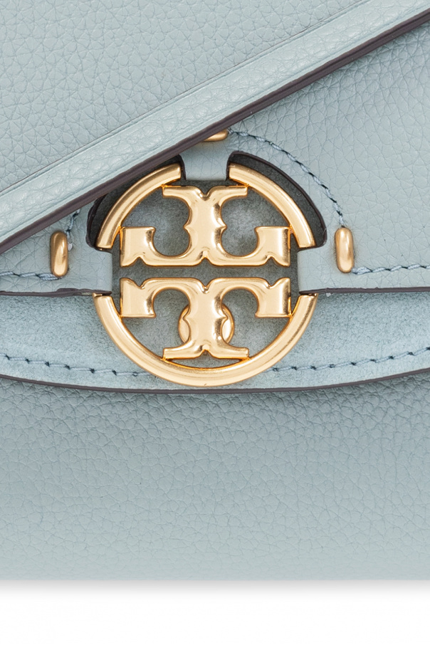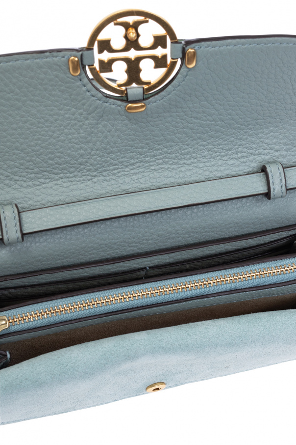 Light greenish-blue ‘Miller’ wallet from Tory Burch. Crafted from grainy leather, this design secures with a snap and showcases a logo application accompanied by a pocket on the front, a back slip pocket, an adjustable shoulder strap, gold-tone metal hardware and an interior with two compartments, one zip pocket, one slip pocket and six card slots.