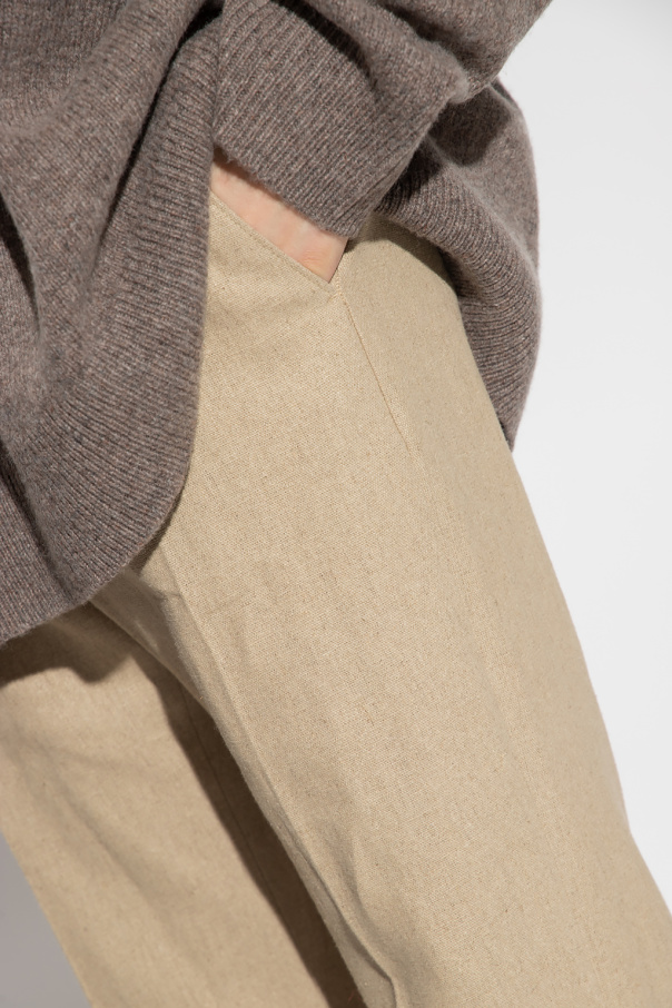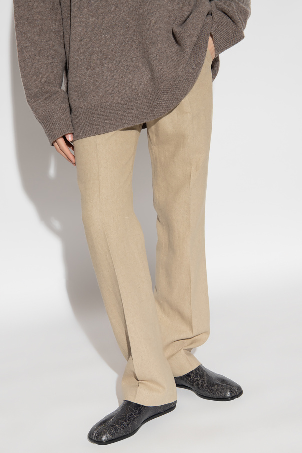 Beige ‘Feijoa’ pleat-front trousers from Jacquemus. Crafted from cotton, this pair features a zip and hook fastening, two slip pockets, buttoned pocket and straight legs.