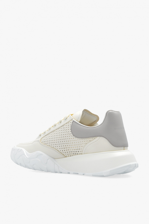 Cream and grey ‘New Court’ sneakers from Alexander McQueen. Crafted from leather with a distinctive perforation, this lace-up model features a silver-tone logo print and a white an cream rubber sole. Swappable laces included.