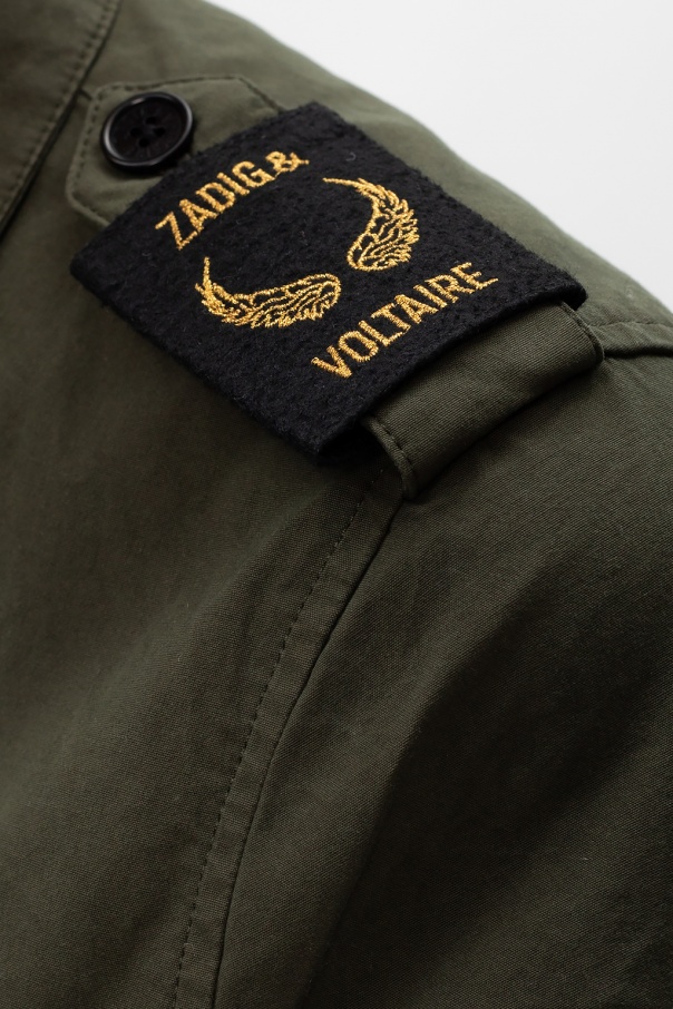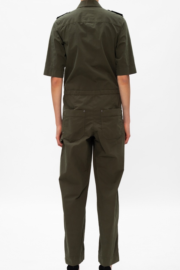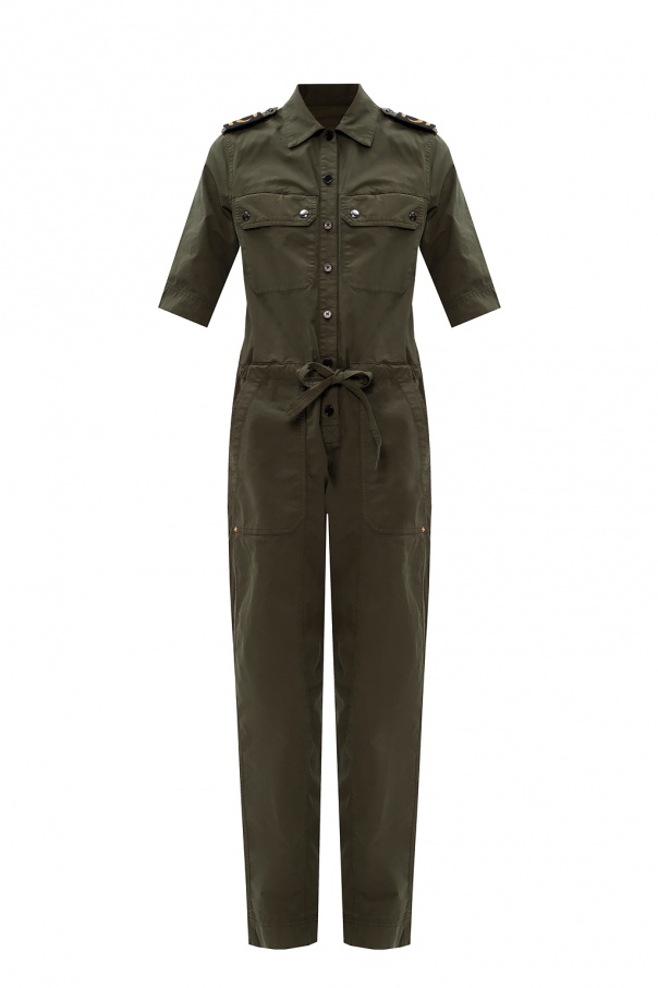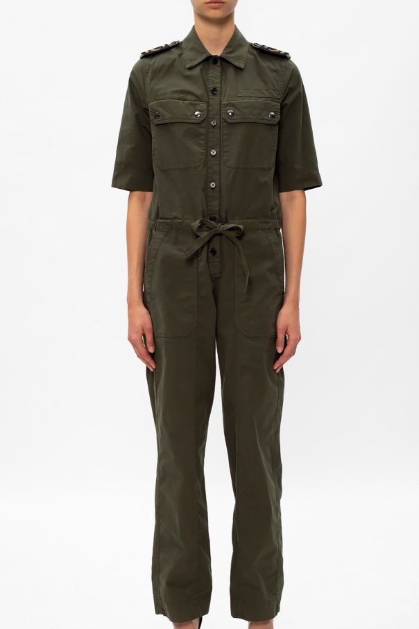 Dark green military jumpsuit from Zadig & Voltaire. Crafted from cotton, this style fastens via buttons and employs logo appliqué, six pockets (including four patch ones and two snap-fastened ones) as well as short sleeves and self-tie belt to accentuate the waist.
