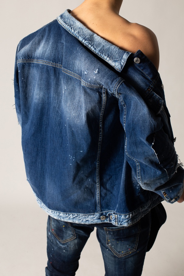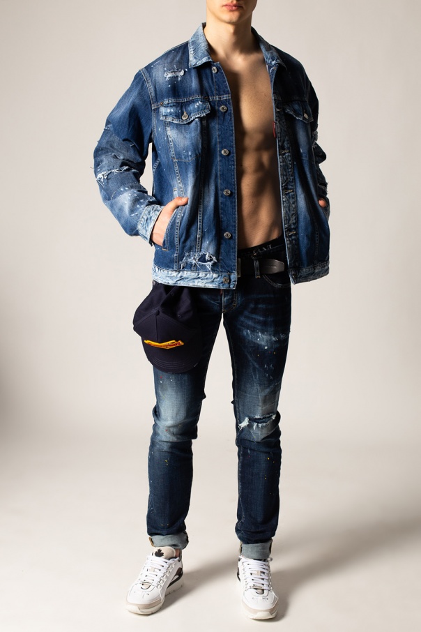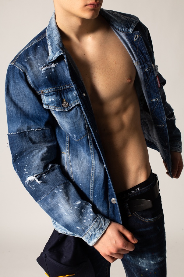 Navy ‘Over Jean’ denim jacket from Dsquared2. Made of cotton, this design features button fastenings, bleached and worn effect, two slip pockets, two buttoned flap pockets and a red patch with a white logo.